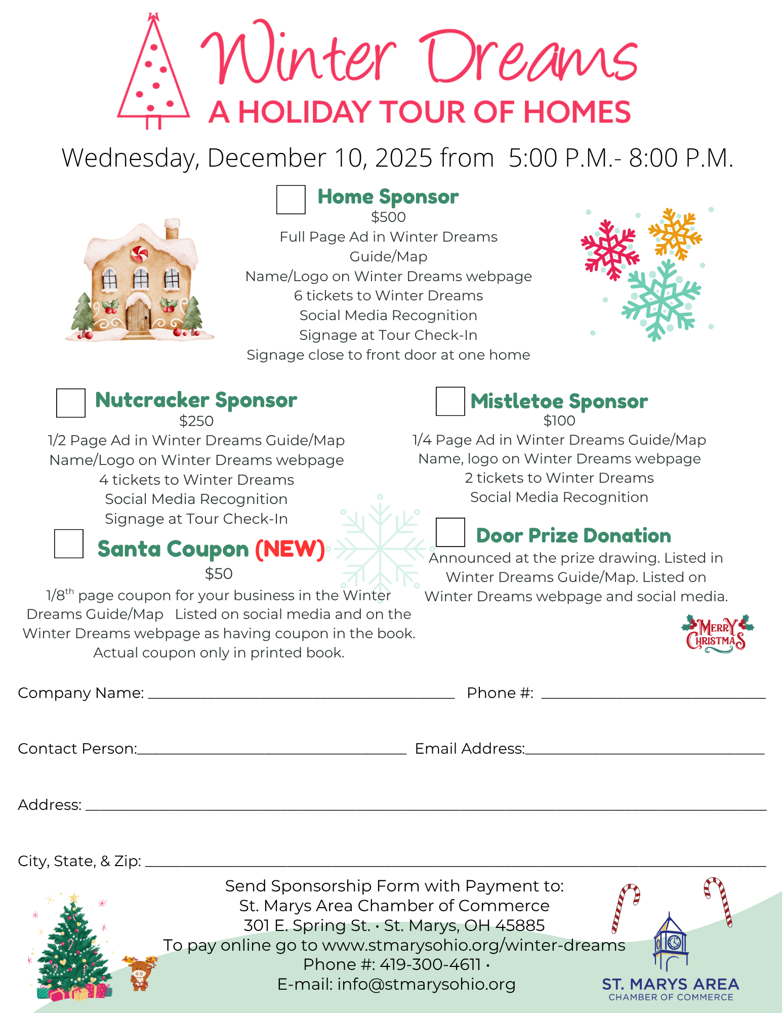 Join the St. Marys Area Chamber of Commerce as we bring in the holiday season with our 8th Annual Winter Dreams: A Holiday Tour of Homes on Wednesday, December 10th, 2025, from 5:00 pm to 8:00 pm!